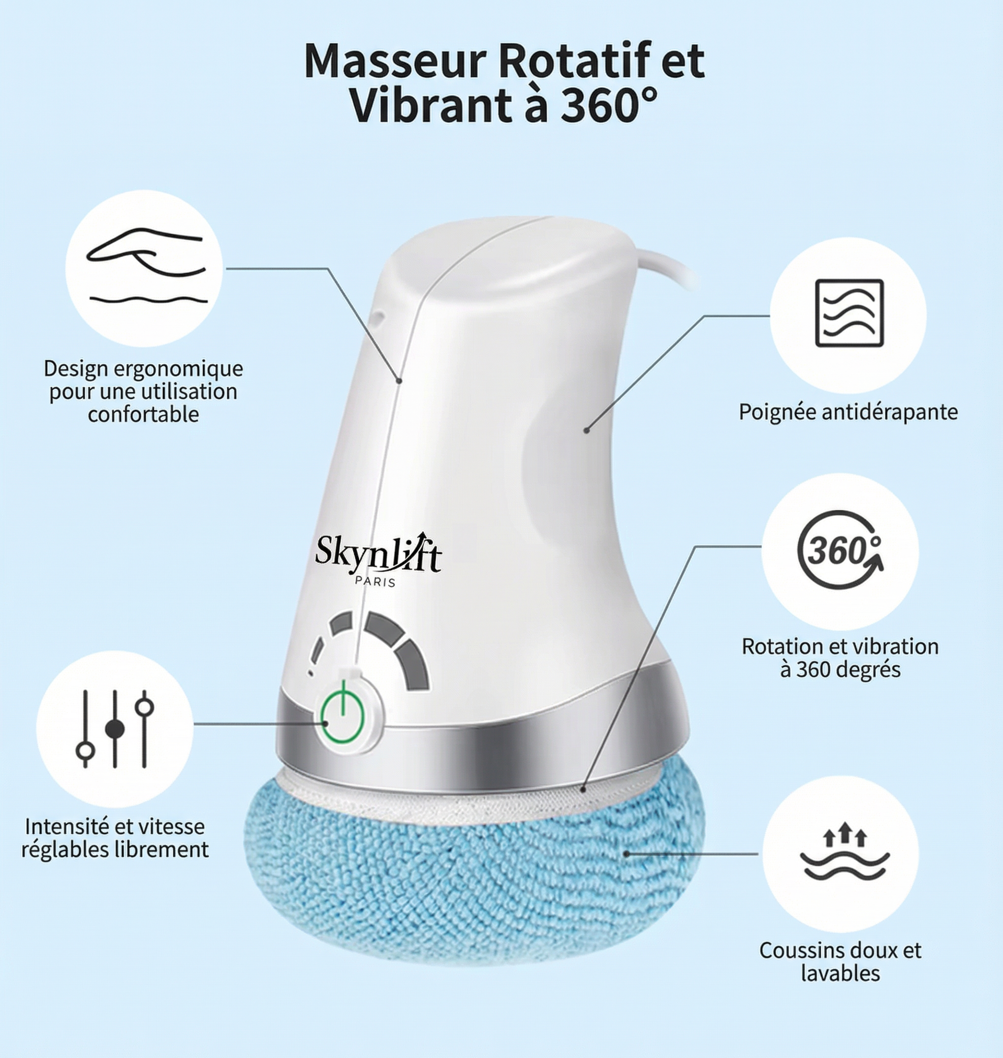 - Tête rotative : Conçue pour un massage uniforme et une stimulation constante